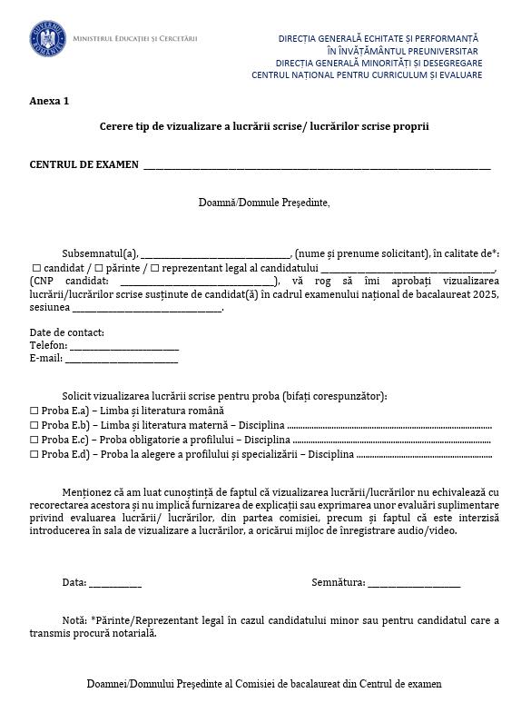 Ministerul Educației și Cercetării a publicat și un formular tipizat pentru această procedură de vizualizare a lucrărilor înainte de contestații. Acest formular trebuie depus la centrul de examen sau trimis prin email în intervall 14:00-17:00 pe 20 iunie 2025.