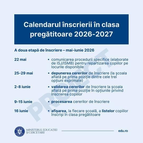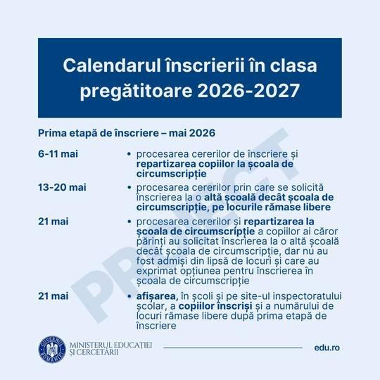 ”Copilul tău începe şcoala la toamnă? Am lansat în consultare publică proiectul de calendar pentru înscrierea în clasa pregătitoare în anul şcolar 2026 – 2027. Părinţii ai căror copii împlinesc 6 ani până la data de 31 august 2026 inclusiv au obligaţia de a înscrie copiii în clasa pregătitoare”, anunţă, vineri, Ministerul Educaţiei şi Cercetării.