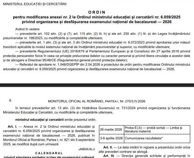 Pe data de 3 aprilie, rezultatele la simularea de la Bac 2026 ar fi trebuit să fie trimise la inspectoratele școlare și apoi în școli, potrivit calendarului oficial. Și tot vineri, 3 aprilie, elevii urmau să-și afle notele.