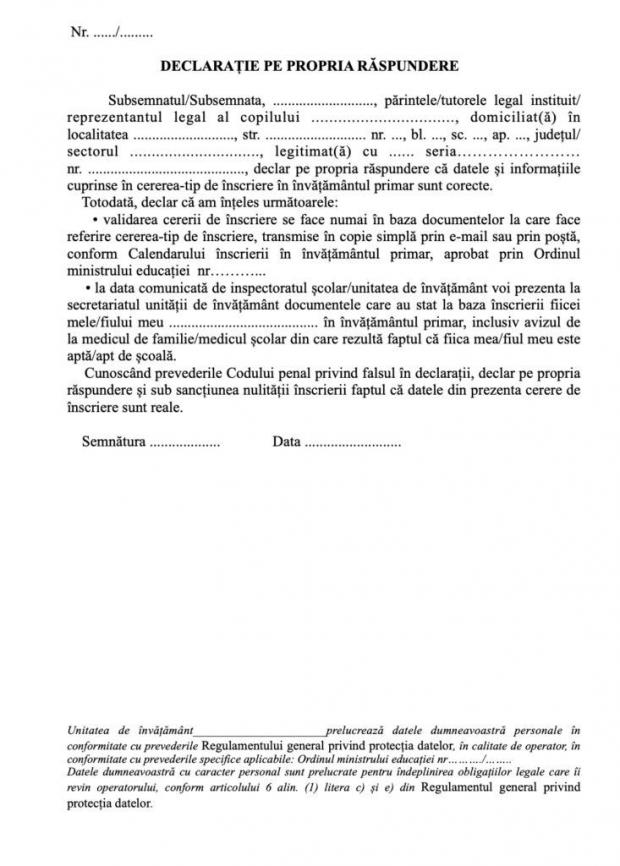 În situația completării online a cererii de înscriere sau a transmiterii prin e-mail sau prin poștă, părintele va transmite unității de învățământ declarația-tip pe propria răspundere, cu privire la veridicitatea informațiilor completate în cerere, respectiv recomandarea de înscriere în clasa pregătitoare.