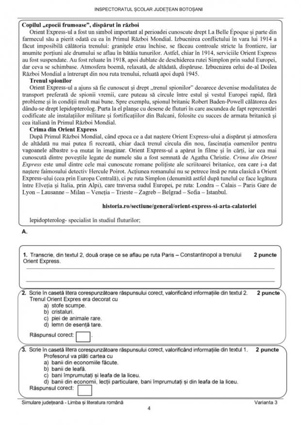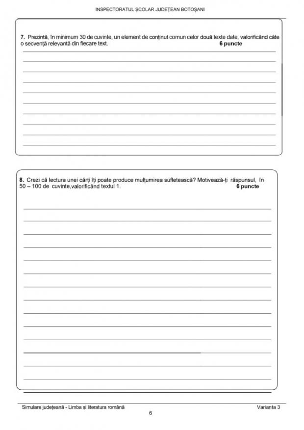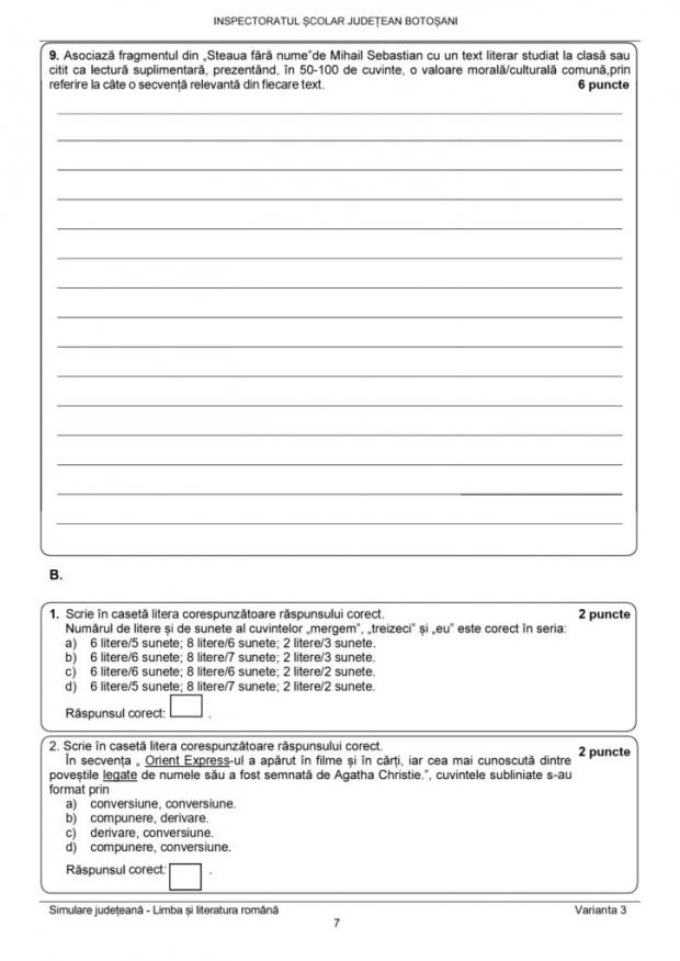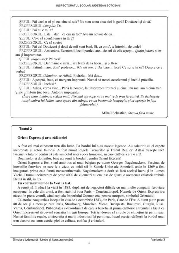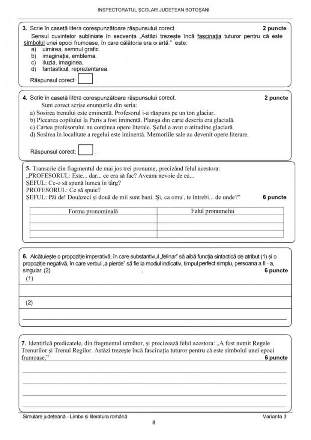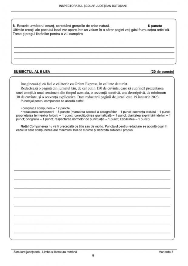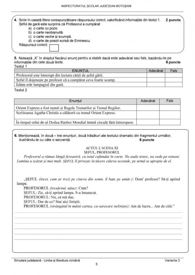 Subiectele susținute de către elevii claselor a VIII-a pentru proba de Limba română de joi, 19 ianuarie, a simulării Evaluării Naționale din județul Botoșani, potrivit edupedu.ro