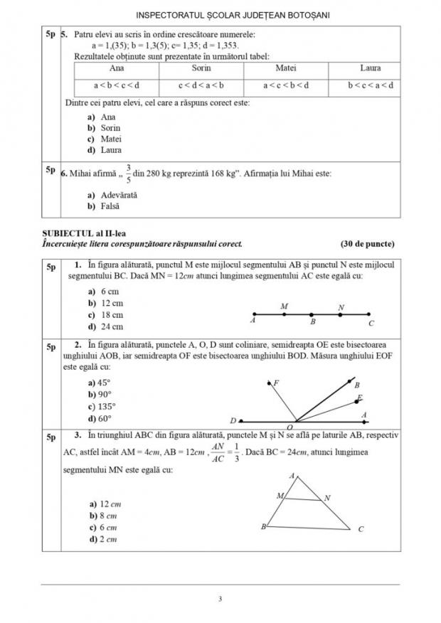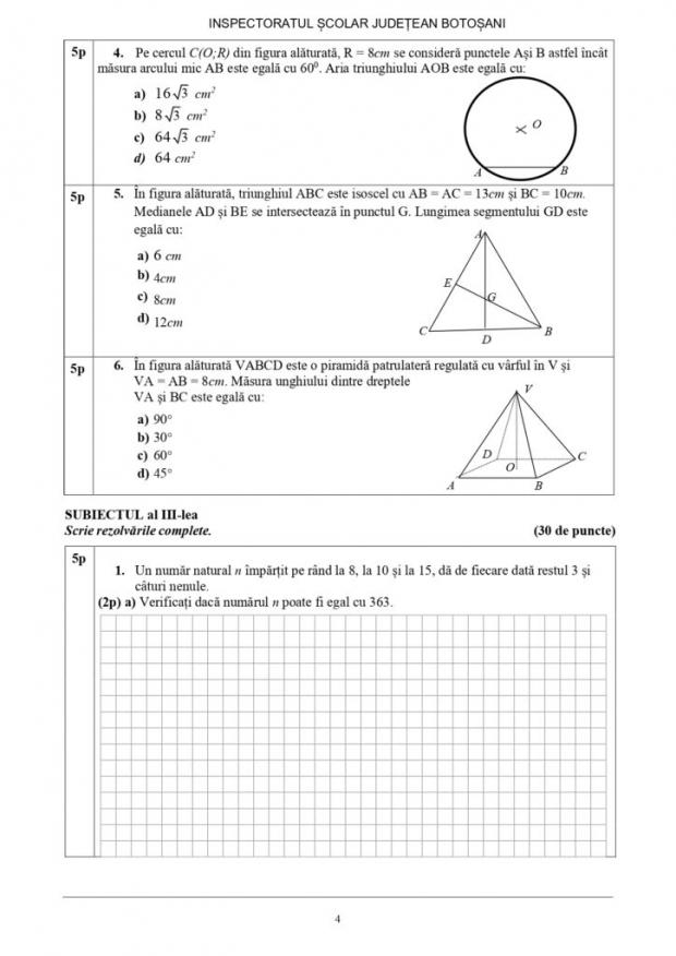Primul subiect a fost format din itemi obiectivi, de tip grilă, la fel și subiectul al II-lea. Cât despre subiectul al III-lea, elevii claselor a VIII-a au fost nevoiți să scrie și să argumenteze în dreptul fiecărei probleme.