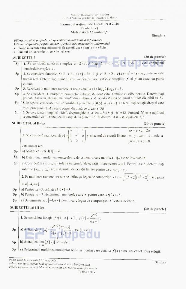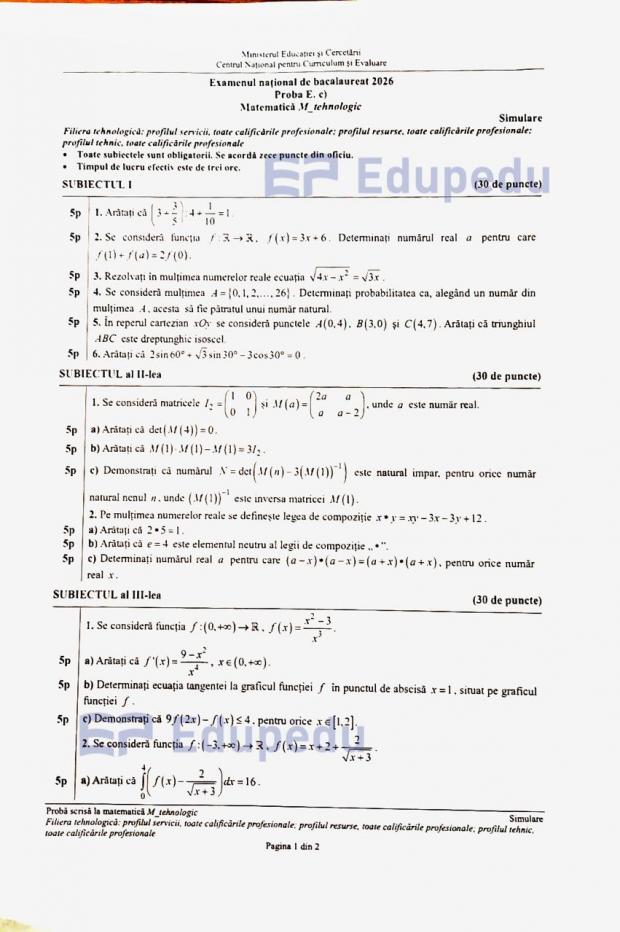 Subiectele la Matematică de la simulare Bac 2026