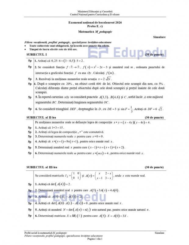 Subiecte Matematică, profil Pedagogic