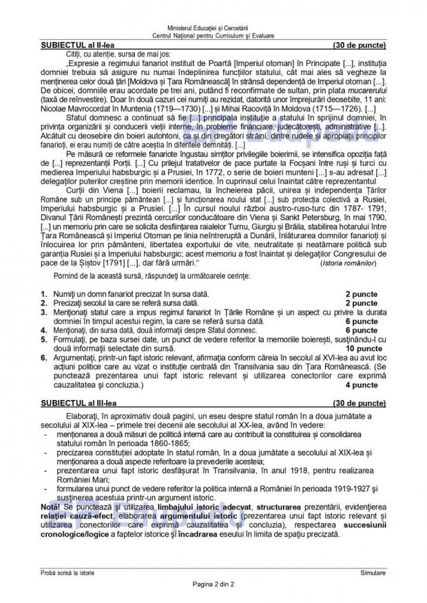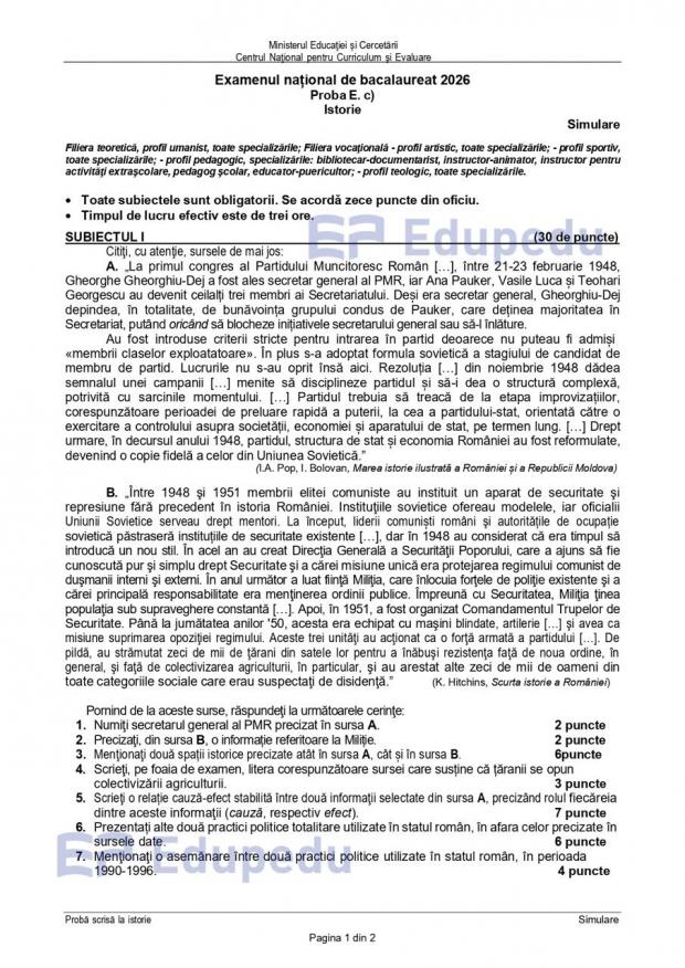 Subiectele la Istorie de la simulare Bac 2026