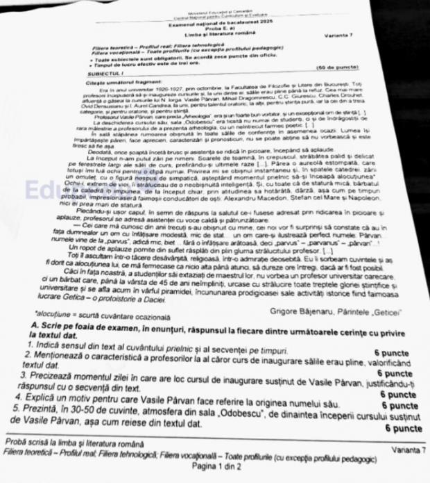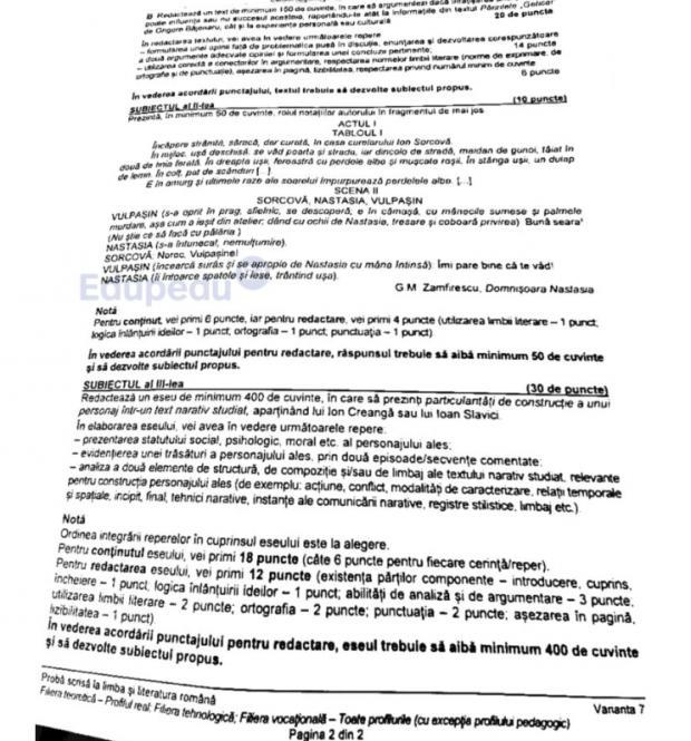 UPDATE 12.55. Varianta extrasă pentru proba scrisă de Limba și literatura română - real și tehnologic - a fost cea cu nr. 7, scrie Edupedu.ro.