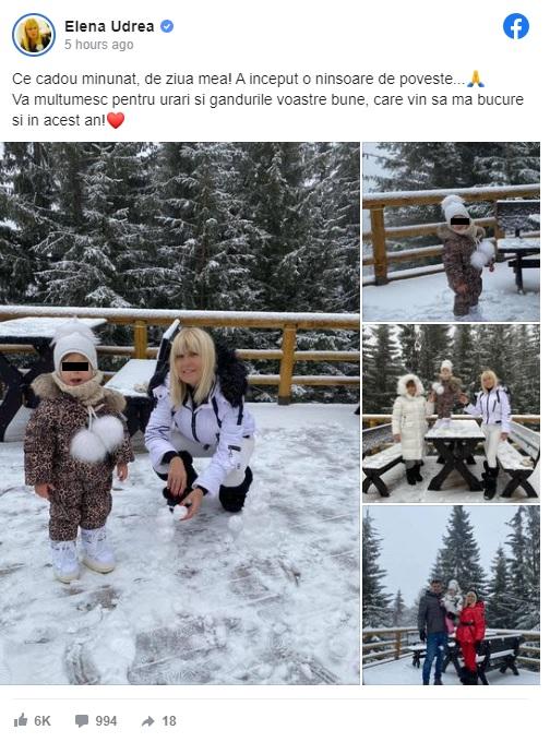 "Ce cadou minunat, de ziua mea! A început o ninsoare de poveste. Vă mulțumesc pentru urări și gândurile voastre bune, care vin să mă bucure și în acest an!", a scris Elena Udrea, pe Facebook.