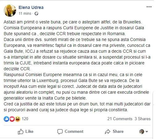 "Astazi am primit o veste buna, pe care o asteptam altfel, de la Bruxelles. Comisia Europeana a raspuns Curtii Europene de Justitie in dosarul Gala Bute spunand ca , deciziile CCR trebuie respectate in Romania.