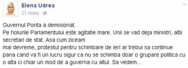 "Guvernul Ponta a demisionat. Pe holurile Parlamentului este agitaţie mare. Unii se văd deja miniştri, alţii secretari de stat. Aşa cum ziceam mai devreme, protestul pentru schimbare de ieri ar trebui să continue până când va fi un lucru sigur că nu se schimba doar o grupare politică cu o alta ci chiar un mod de a guverna cu altul. Să vedem..." a scris Elena Udrea pe Facebook.