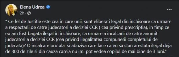 O încălcare brutală și abuzivă care face ca eu să stau arestată ilegal deja de 300 de zile și din cauza căreia nu îmi pot vedea copilul de mai bine de 3 luni”, scrie Elena Udrea pe o rețea socială.