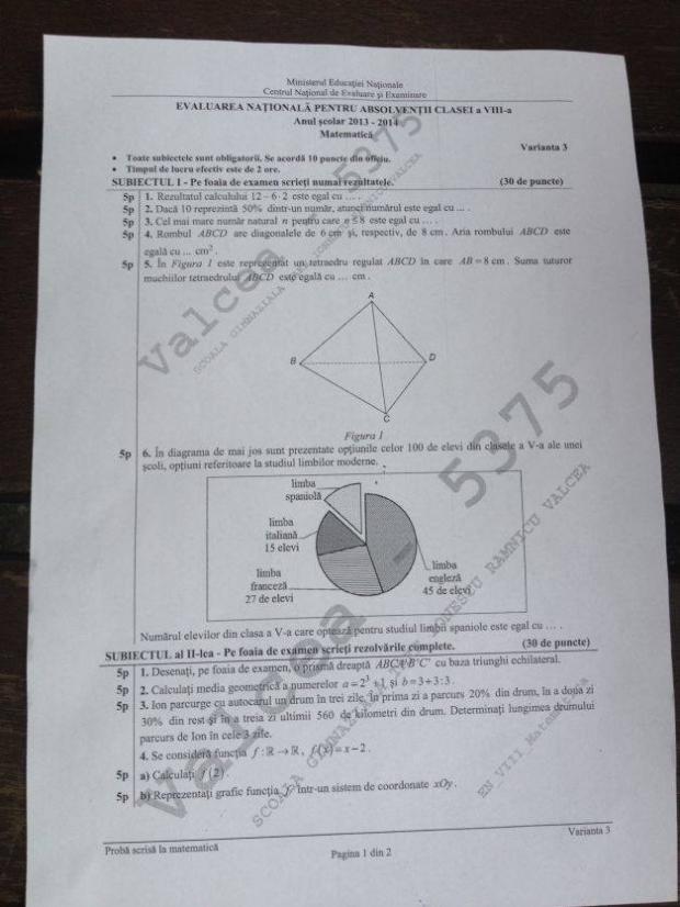 Absolvenţii de clasa a VIII-a susţin miercuri ultimul test din cadrul Evaluării Naţionale, proba scrisă la Matematică, a anunţat Ministerul Educaţiei Naţionale (MEN). Rezultatul va avea o pondere de 75% în media de intrare la liceu.