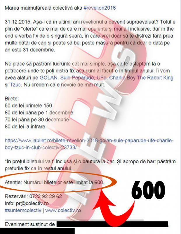 Mai exact, ei au anunțat că, de Revelion, va fi organizată o petrecere grandioasă, iar numărul de locuri pentru petrecăreți urma să fie unul uriaș, mult mai mare decât cel al persoanelor care au privit iadul în ochi în cumplita noapte de 30 spre 31 octombrie. Mai exact, cei trei patroni ai clubului s-au gândit că, deși prețurile sunt mici, pot ”compensa” profitul prin numărul invitațiilor. Așa că, fără să stea prea mult pe gânduri au anunțat, chiar pe contul de socializare al clubului Colectiv că, pentru noaptea de Revelion, una în care îndemnau la distracție udată din plin de alcool, sunt disponibile nu mai puțin de 600 de invitații. Iar asta în ciuda faptul că, teoretic, în acte, erau doar 80 de locuri...