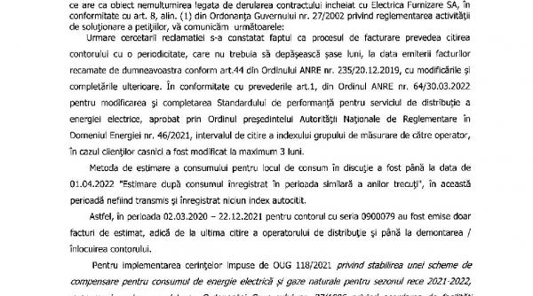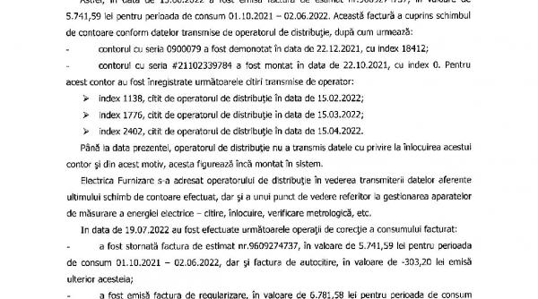 "După această şedinţă, am primit oficial o foaie de la Distribuţie Energie Electrica în care este specificat faptul că într-adevar nu au venit în perioada 02.03.2020 – 22.12.2021 deloc la citirea de regularizare pentru contorul nr. 1, iar în acelaşi tabel au minţit că la contorul nr. 2 montat în 22.12.2021 şi demontat în 13.05.2022 au citit contorul în data de 15.02.2022, 15.03.2022, 15.04.2022 şi în 13.05.2022, fapt ce este total neadevărat, pentru că nu am primit niciun fel de factură în toată perioada existenţei acestui contor şi încă o dovadă că au minţit că au citit în acele luni, este faptul că toate facturile, patru la număr pentru acest contor, au fost emise toate odată în data de 19.07.2022 (după 7 luni ).