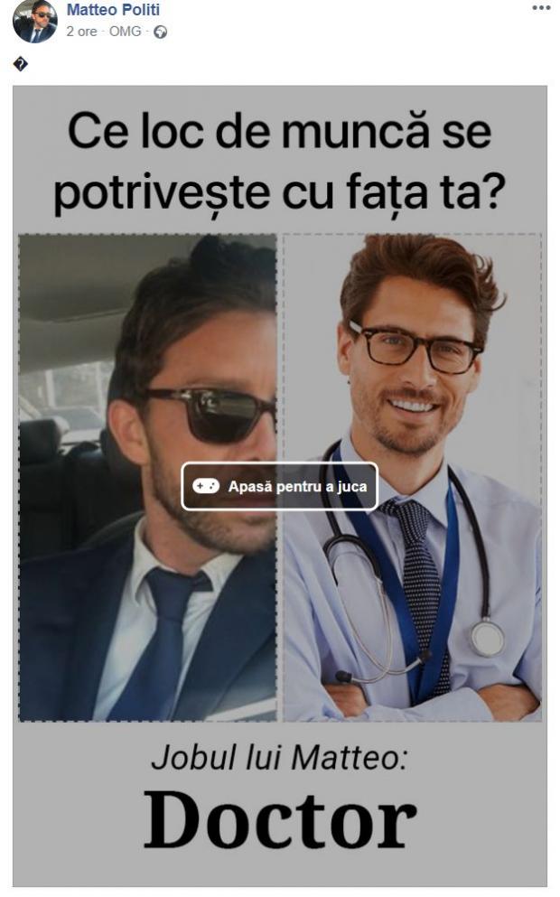 “Ce loc de muncă se potriveşte cu faţa ta?” este numele aplicaţiei de Facebook cu care s-a jucat azi Politi şi se pare că rezultatul lui este “doctor”. Lui Politi pare că i-a plăcut coincidenţa, aşa că a postat pe contul său rezultatul, scrie Libertatea.