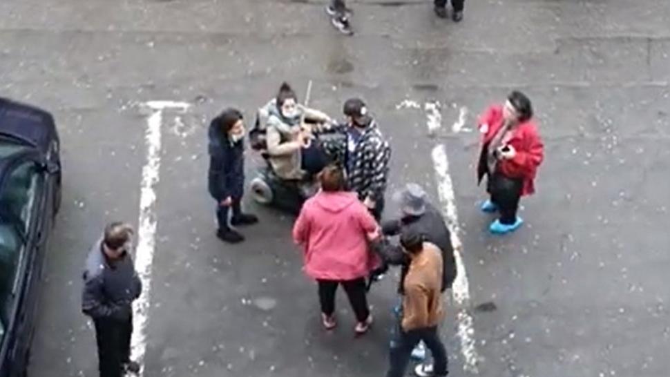 În imagini se văd mai multe persoane care o lovesc pe femeia cu handicap, iar la final un tânăr îi răstoarnă scaunul cu rotile și fuge la o mașină parcată. Autoturismul a demarat, iar trecatorii au ajutat-o pe femeia bătută.