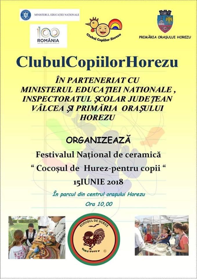 Clubul Copiilor Horezu județul Vâlcea organizează vineri 15 IUNIE 2018, a XIII a ediție a Festivalului Național „Cocoșul de Hurez pentru copii”.