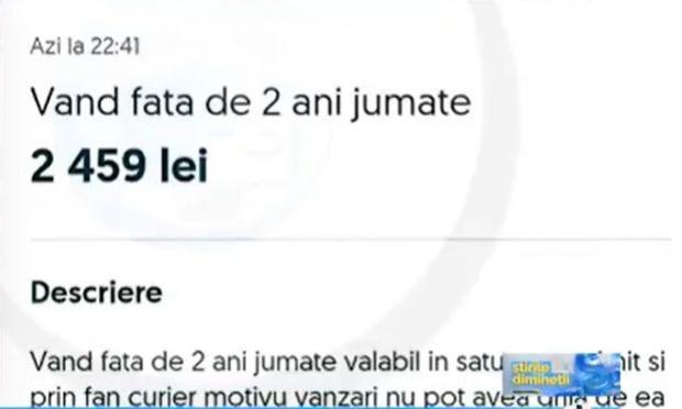 În anunț se mai specifică faptul că este scoasă la vânzare o fată de doar 2 ani și jumătate, în Satu Mare, însă, dacă existau doritori și din alte zone ale țării, ”proprietarii” erau dispuși să o trimită prin curier.