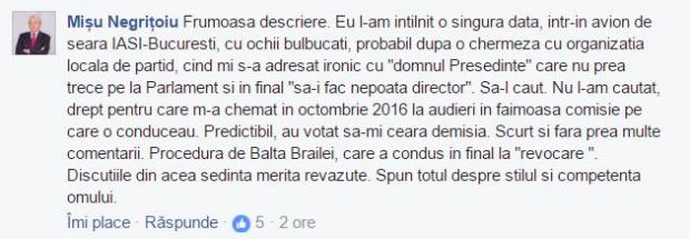 ”Eu l-am intilnit o singura data, intr-un avion de seara Iasi-Bucuresti, cu ochii bulbucati, probabil dupa o chermeza cu organizatia locala de partid, cind mi s-a adresat ironic cu "domnul Presedinte" care nu prea trece pe la Parlament si in final "sa-i fac nepoata director". Sa-l caut. Nu l-am cautat, drept pentru care m-a chemat in octombrie 2016 la audieri in faimoasa comisie pe care o conduceau. Predictibil, au votat sa-mi ceara demisia. Scurt si fara prea multe comentarii. Procedura de Balta Brailei, care a condus in final la "revocare ". Discutiile din acea sedinta merita revazute. Spun totul despre stilul si competenta omului", scrie Misu Negritoiu.