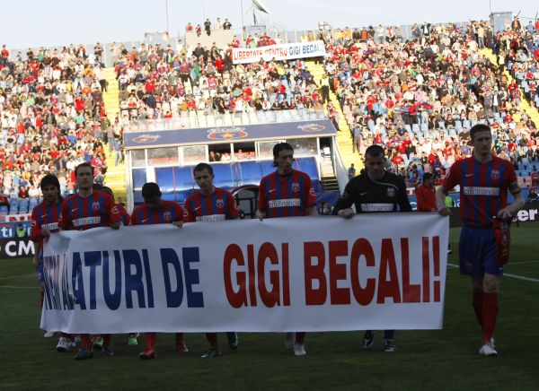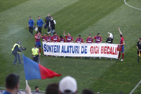 Nici jucătorii echipei de fotbal pe care Gigi Becali o finanţează nu au stat degeaba. La meciul de fotbal Steaua - Gloria Bistriţa, din etapa a XXII-a din Liga I, desfăşurat sâmbătă în Bucureşti, aceştia au intrat pe teren afişând un mesaj de susţinere pentru omul de afaceri, inscripţionat pe un banner: