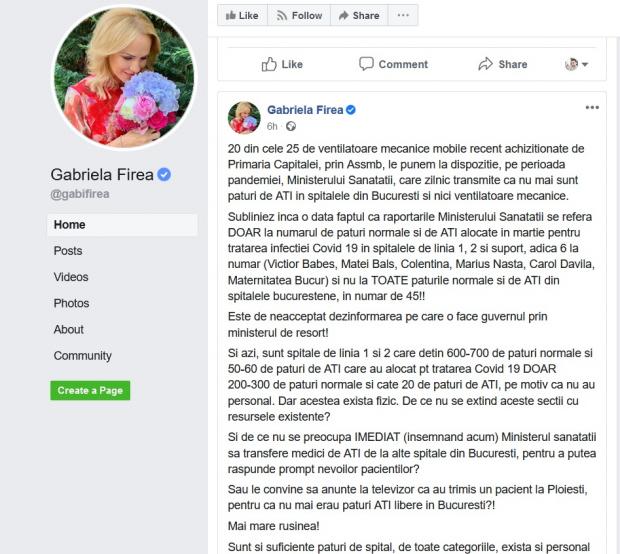 Anterior, într-o altă postare, Gabriela Firea a acuzat Guvernul că dezinformează când spune că în București nu mai sunt paturi pentru bolnavii de COVID-19. Edilul a aduugat că românii sunt speriați cu declarații false la televizor, deoarece se dorește să fie stare de panică în rândul populației.