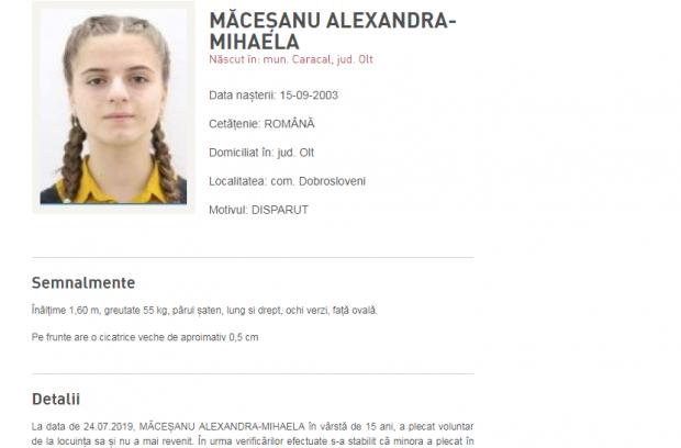 Mai precis, duminică, atunci când au afișat pe site-ul Poliției Române dispariția Alexandrei, polițiștii i-au scris greșit numele. Au scris MÂCEȘANU în loc de MĂCEȘANU.
