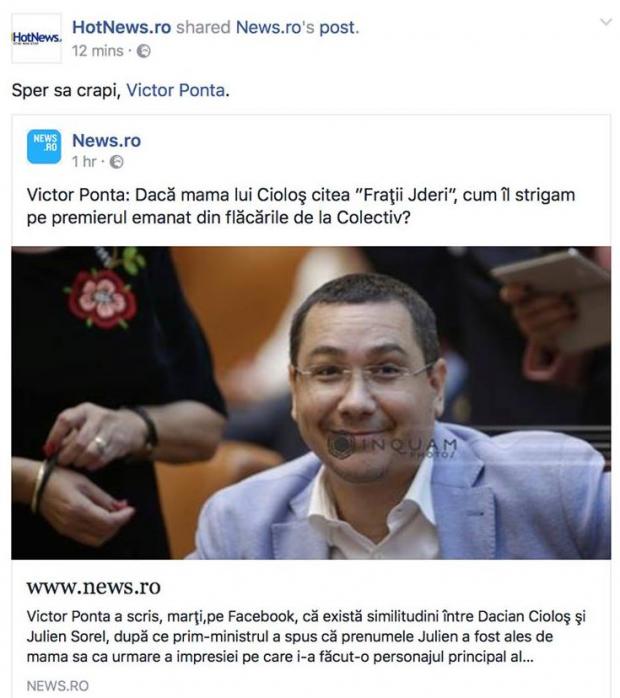 Gafă incredibilă a jurnaliştilor de la Hotnews. Cei care se ocupă de pagina de Facebook a ziarului online au distribuit o ştire cu Victor Ponta şi au scris drept introducere, "Sper să crapi, Victor Ponta".