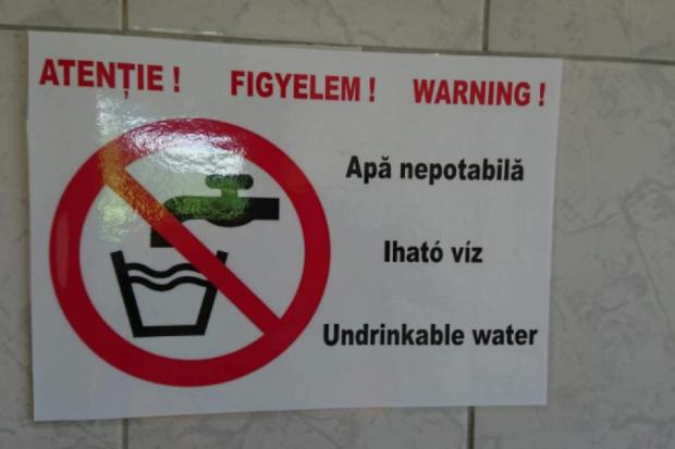 Lângă robinetul de apă de la toaleta construită de Consiliul Județean Salaj este scris un mesaj in trei limbi - romana, maghiara și engleză - in care populația este alertată ca apa nu este potabilă, ci este contaminata.