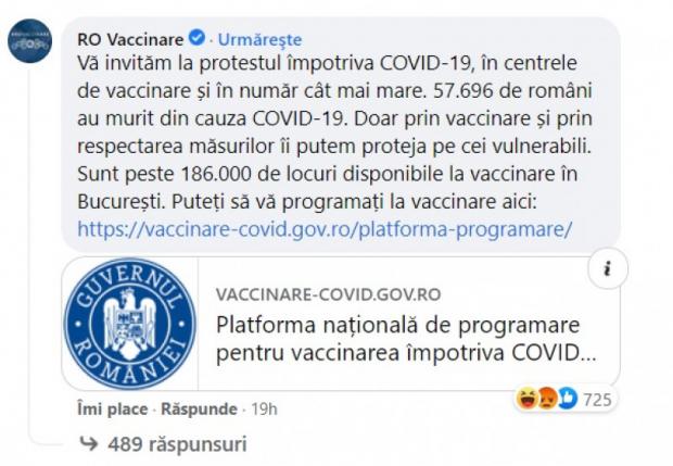 „Vă invităm la protestul împotriva COVID-19, în centrele de vaccinare și în număr cât mai mare. 57.696 de români au murit din cauza COVID-19. Doar prin vaccinare și prin respectarea măsurilor îi putem proteja pe cei vulnerabili. Sunt peste 186.000 de locuri disponibile la vaccinare în București”, e mesajul postat de RO Vaccinare.