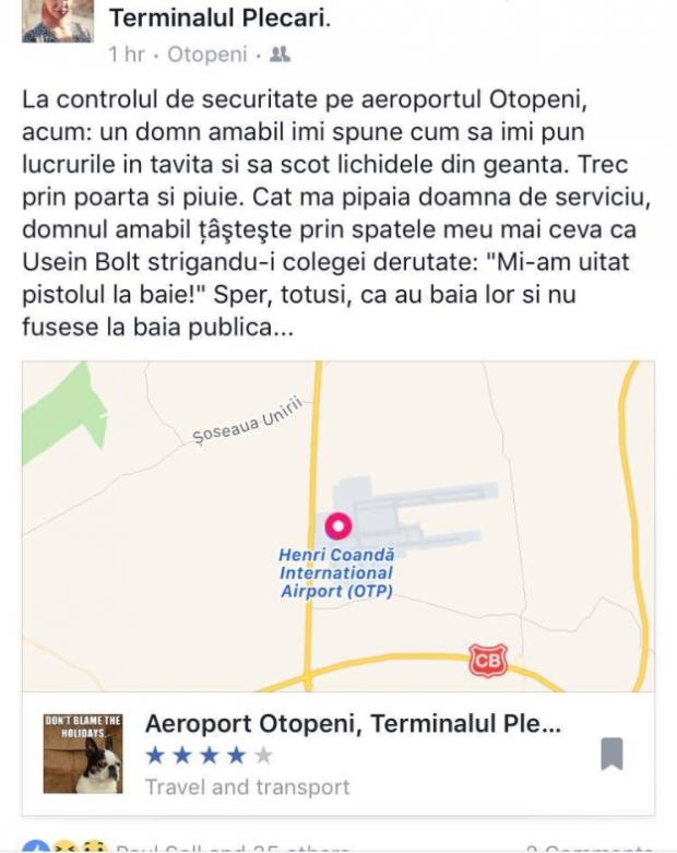 Grav incident de securitate pe Aeroportul Otopeni. O tânără povestește pe Facebook că, în momentul în care se afla la Terminalul Plecări, a auzit un agent de securitate spunându-i unei colege că și-a uitat pistolul din dotare... la baie.