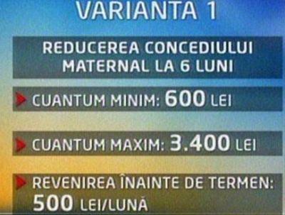 Nici una dintre variante nu este în avantajul mamelor. Prima variantă presupune reducerea concediului maternal de la 24 de luni la şase luni şi menţinerea aceluiaşi nivel al indemnizaţiilor. Mamele care s-ar întoarce după şase luni la muncă ar primi 500 de lei/lună în plus la salariu.