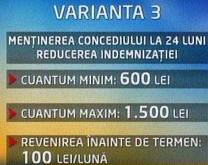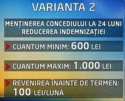 Cea de-a doua variantă presupune menţinerea concediului maternal la 24 de luni şi reducerea indemnizaţiei, astfel încât cuantumul minim să fie de 600 de lei şi cel maxim de 1.000 de lei. Mamele care s-ar întoarce înainte de termen la serviciu ar primi 100 lei/lună la salariu.