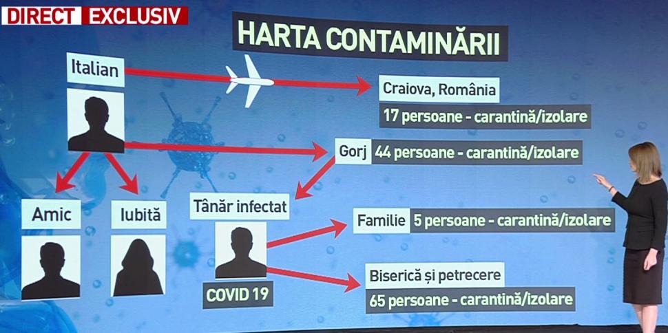 Merge la Gorj şi apoi 44 de persoane intră în izolare. La Gorj avem şi primul tânăr infectat care a intrat în contact cu italianul. La rândul său, tânărul intră în contact cu alte persoane. Din familia sa, 5 persoane se află în carantină sau izolare. Acest tânăr merge la o petrecere. Tatăl său vitreg este preot. Și, în urma acestor lucruri, 65 de persoane intră în carantină. Astfel, avem 133 de persoane în carantină sau izolare", a spus Cătălina Porumbel.