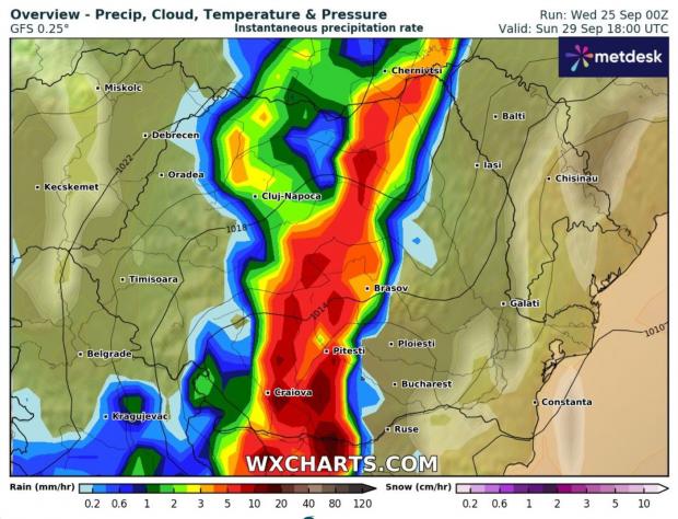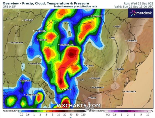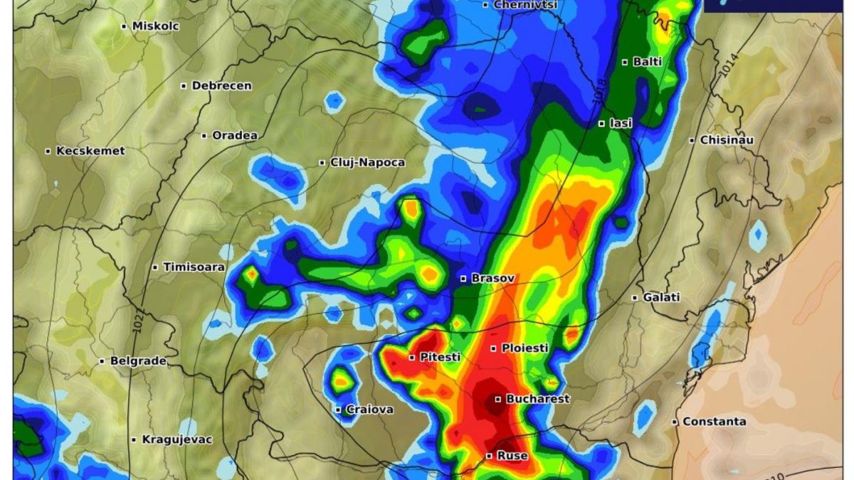 Pe parcursul nopții furtuna se mută către centrul țării, potrivit simulărilor meteo. Ploi abundente ar putea avea loc și în zona Clujului.