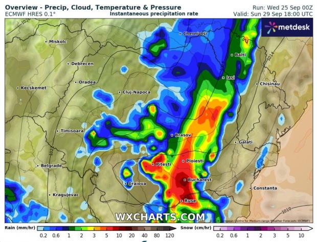 Cantitățile, așa cum arată informațiile la acest moment estimate pentru intervalul de sâmbătă până luni, punctiform 60-80l/m² ne încadrăm la aceste valori în codul portocaliu și cele mai mari valori sunt de așteptat punctiform, în special în partea de vest, sud și centru a țării. Dacă vom constata, în funcție de dinamica fenomenelor, că vom depăși pragul de 80-100l/m², sigur că vom interveni cu avertizările meteorologice de tip nowcasting de cod roșu, așa cum am făcut-o de fiecare dată”, a spus șefa ANM, Elena Mateescu, în direct la Antena 3 CNN.