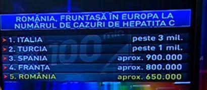 Cifrele absolute, adică numărul celor bolnavi de Hepatita C, ne plasează pe locul 5 în Europa, cu o estimare de 650.000 de bolnavi, cifra incluzându-i şi pe cei care nu sunt conştienţi de boala pe care o poartă.