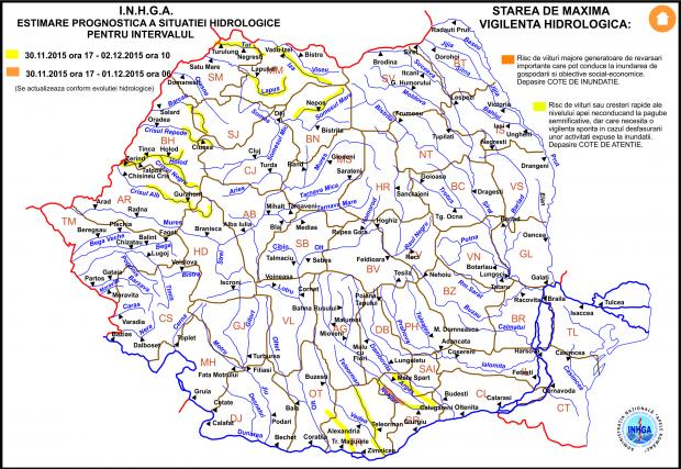 De asemenea, în intervalul, 30 noiembrie 2015, ora 17,00 - 2 decembrie, ora 10,00, se instituie Cod galben de inundaţii pe râurile din bazinele hidrografice: Tur (judeţul Satu Mare), Iza (judeţul Maramureş), Lăpuş (judeţul Maramureş), Someşul Mare (judeţul Bistriţa Năsăud), afluenţii mici ai râului Someş aferenţi sectorului Dej-Satu Mare (judeţele Sălaj, Maramureş şi Satu Mare), Barcău-bazin superior (judeţele Sălaj şi Bihor), Crişul Repede - afluenţii din bazinul superior şi mijlociu (judeţele Cluj şi Bihor), Crişul Negru (judeţul Bihor), Crişul Alb - afluenţii din bazinul superior şi mijlociu (judeţele Arad şi Hunedoara), Călmăţui (judeţele: Olt şi Teleorman), râul Vedea - sector aval confluenţă Teleorman (judeţul Teleorman), Teleorman şi afluenţii mici ai râului Vedea (judeţul Teleorman), Neajlov - sector aferent judeţului Giurgiu, Sabar - bazin inferior (judeţele: Giurgiu şi Ilfov).