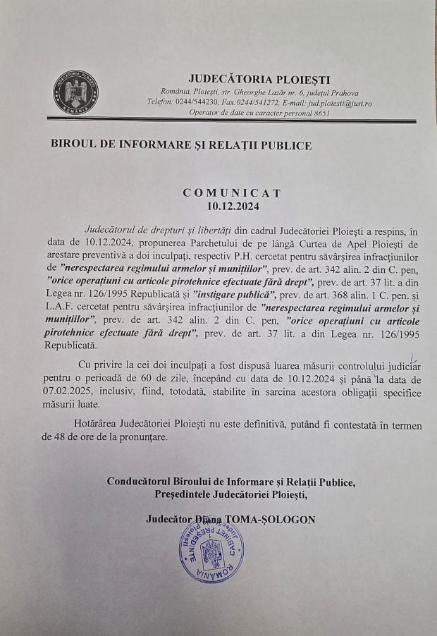 "În urma cercetărilor s-a stabilit că, în noaptea de 7/8 decembrie, inculpaţii P.H. şi L.A.F. şi alte persoane se deplasau spre Municipiul Bucureşti, având asupra lor arme albe (macete, săbii, pumnale), arme de foc, precum şi importante sume de bani (aproximativ 18.000 USD şi 25.000 lei), laptopuri, medii de stocare şi o dronă profesională, cu privire la care se presupune că urmau a fi folosite pentru instigarea unor persoane în comiterea de infracţiuni în cadrul unor întruniri publice neautorizate şi recompensarea acestora", se arată în comunicat.