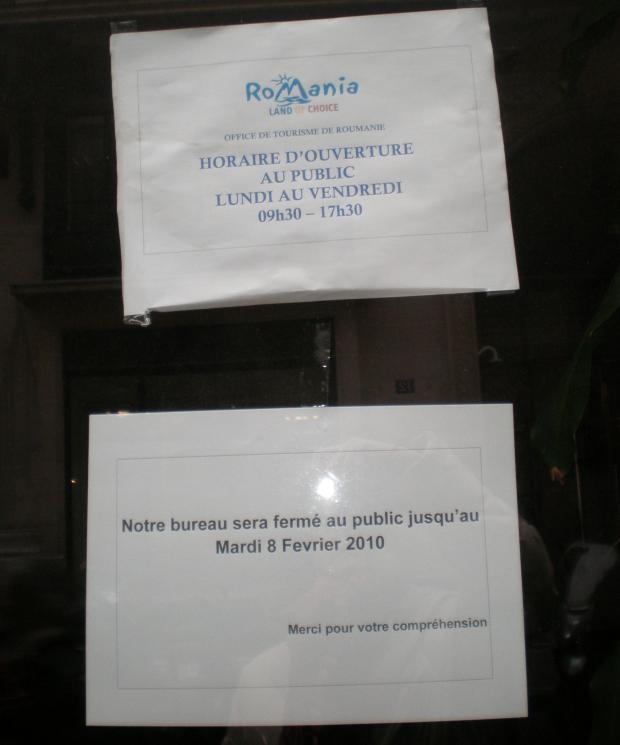 "Afişul lipit pe uşă specifică reluarea activităţii după data de 8 februarie 2010!!!", mai scrie cititoarea Antena3.ro, care ne-a ataşat şi câteva fotografii care să dovedească lipsa unei activităţi de cel puţin un an. Pe acestea se observă cum nici sigla sloganului "Land of choice" nu a fost schimbată cu frunza din Grădina Carpaţilor. Să nu ne mai mirăm, aşadar, că din Franţa ne vin "turişti" doar pe căile expulzării.