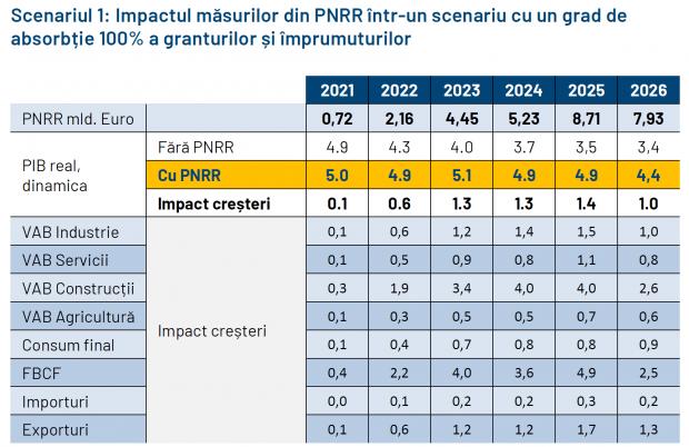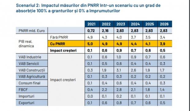 Utilizarea exclusivă a granturilor ar genera o creștere economică exprimată în PIB de 4,3 puncte procentuale în perioada 2021-2026, iar anul de vârf ar fi 2023, se precizează în document.