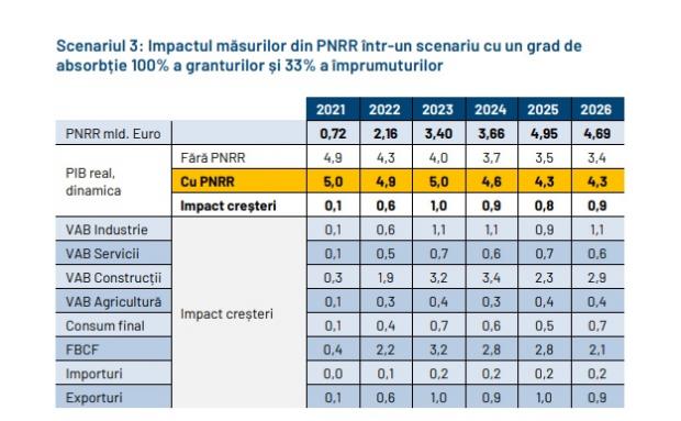 Scenariul III prevede absorbția integrală a granturilor fără accesarea împrumuturilor, ceea ce, potrivit calculelor, ar genera o creștere a PIB de 3,4% în perioada 2021-2026.