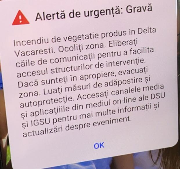 ”Incendiu de vegetație în Delta Văcărești. Ocoliți zona. Eliberați căile de comunicații pentru a facilita accesul structurilor de intervenție. Dacă sunteți în apropiere, evacuați zona. Luați măsuri de adăpostire și autoprotecție. Accesați canalele media și aplicațiile din mediile on-line ale DSU și IGSU pentru mai multe informații și actualizări despre eveniment”.