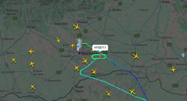 În imaginea următoare: zborul HYS8711 în buclă de așteptare, conform site-ului de monitorizare Flight Radar.