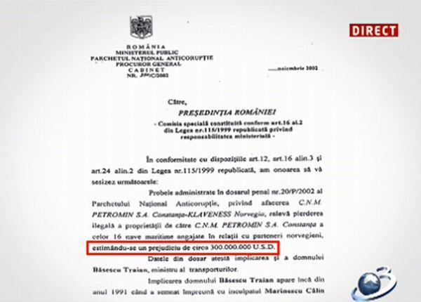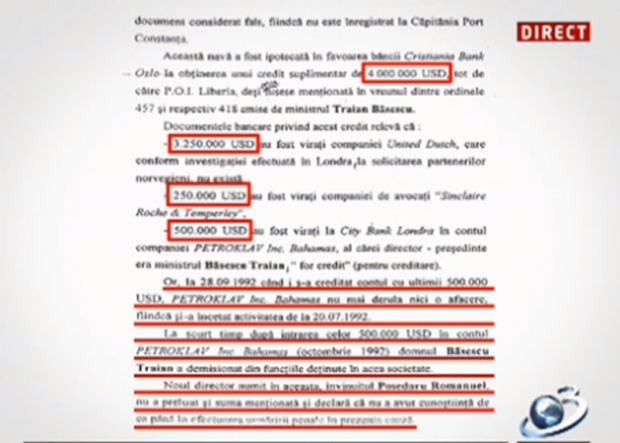 - 500.000 de dolari au fost vraţi la City Bank of Londra la contul companiei PETROKLAV Inc. Bahamas, al cărei director - preşedinte era ministrul Traian Băsescu.
