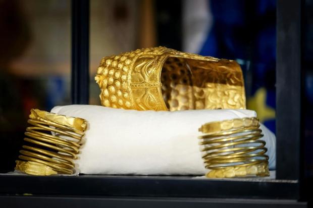 Coiful de la Coțofenești și cele două brățări dacice au fost prezentate într-o conferință de presă, la muzeul din Drents FOTO: Profimedia Images