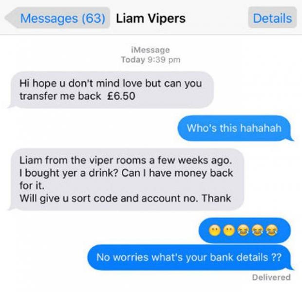 Acesta dorea înapoi banii pentru băutura pe care i-a oferit-o. Fata i-a cerut contul şi i-a virat banii, apoi a publicat conversaţia pe o reţea de socializare.