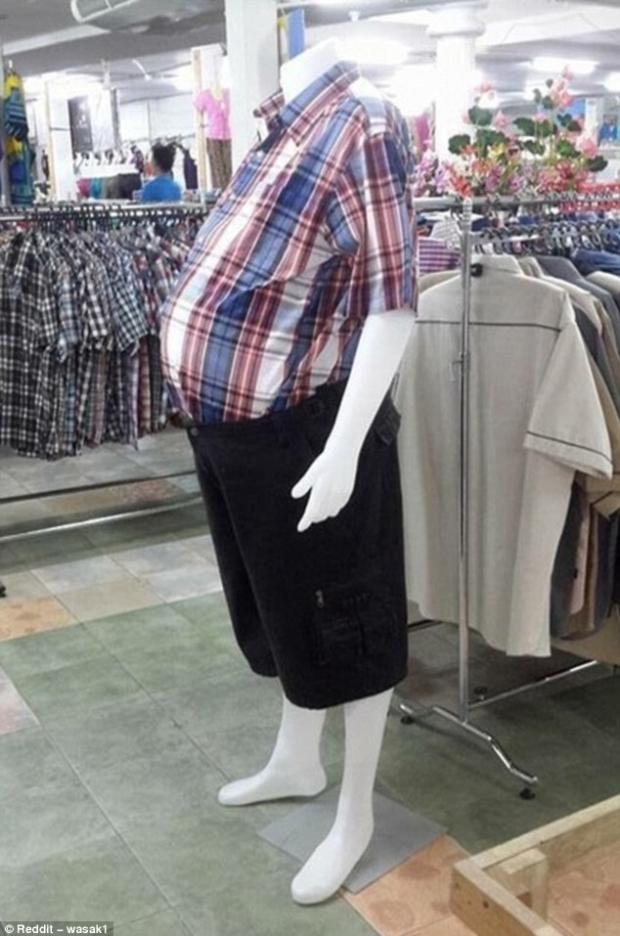 Manechinul îmbrăcat de vânzătoare într-o cămașă și o pereche de pantaloni până la genunchi, avea abdomenul bombat, ca o ”burtă de bere”.
