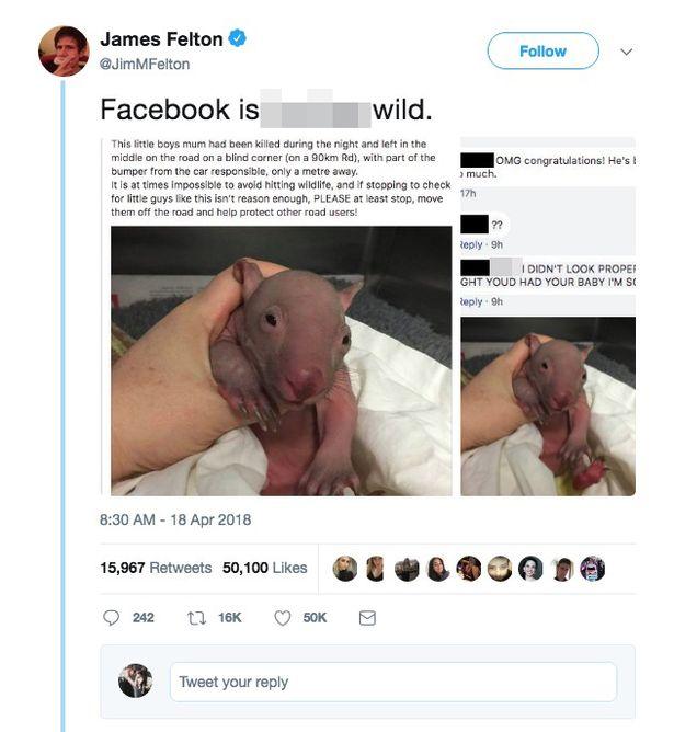 Femeia găsise un pui de wombat pe marginea drumului, pe care l-a adoptat imediat. După ce a pus pozele pe Facebook, prietena sa a crezut că este sărbătoare mare în familie, pentru că s-a născut un copil.