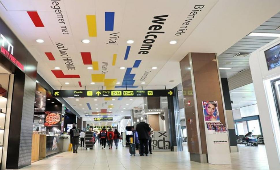 Mesajul „Bine ați venit”, tradus în mai multe limbi străine, a fost montat pe tavanul aeroportului Otopeni, însă în zona de „plecări”, în apropierea primelor porți de îmbarcare.