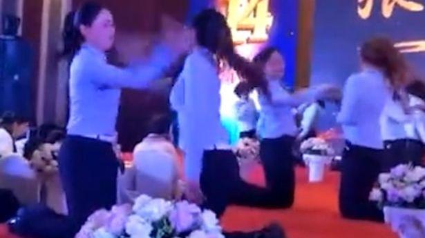 Femeile, care lucrează la o companie de frumusețe din China, sunt obligate să îngenuncheze și să se pălmuiască una pe cealaltă, până când șefii lor le spun să se oprească.