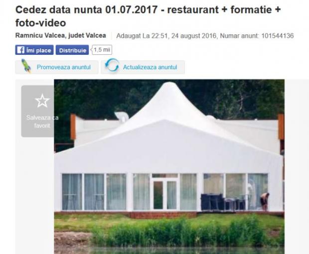 „Nunta reprezintă cel mai important pas din viața unui cuplu, iar noi am ales pentru acest eveniment data de 01.07.2017, dată rezervata cu doi ani înainte (restaurant, formație, servicii foto-video). Pentru că viața a avut alt plan pentru noi, suntem nevoiți să renunțăm la organizarea acestui eveniment(...). Preferăm să cedam toate serviciile (pentru plata tuturor avansurilor oferim un discount din valoarea acestora)”, se arată în anunțul publicat pe 24 august.